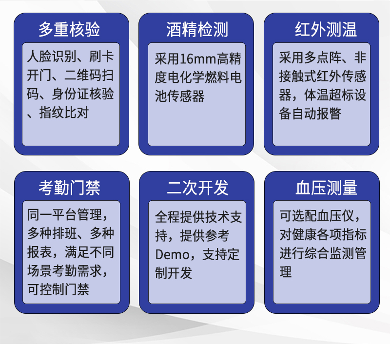 小门卫岗前人脸识别血压酒精考勤打卡机防代吹 不仅能规范考勤管理、规避因 “代打卡”“酒后上岗”“健康隐患” 引发的安全事故与法律风险,还能通过数据化管理提升岗位安全管控效率,减少事故带来的经济损失与声誉影响;对员工而言,设备既保障了自身及同事的作业安全,也通过实时健康监测及时发现身体异常,体现企业人文关怀,构建 “健康至上” 的工作氛围。