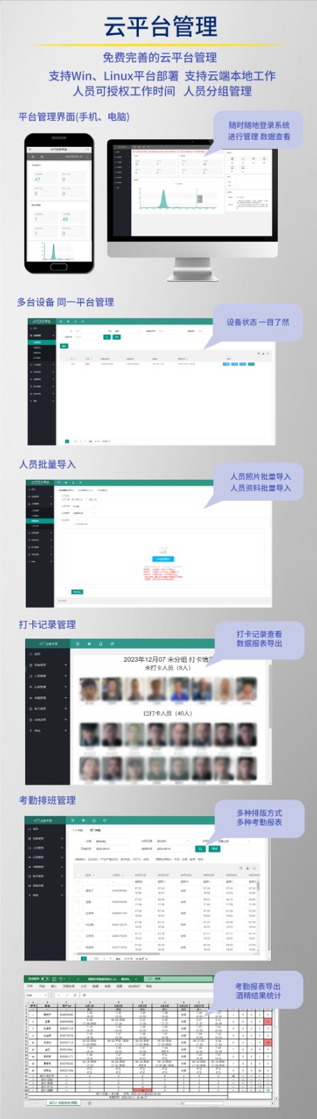 核心功能模块。人脸识别考勤:采用活体检测技术,避免照片、视频等手段,快速完成身份确认与签到记录,精度通常可达 99.5% 以上,响应时间小于 1 秒。