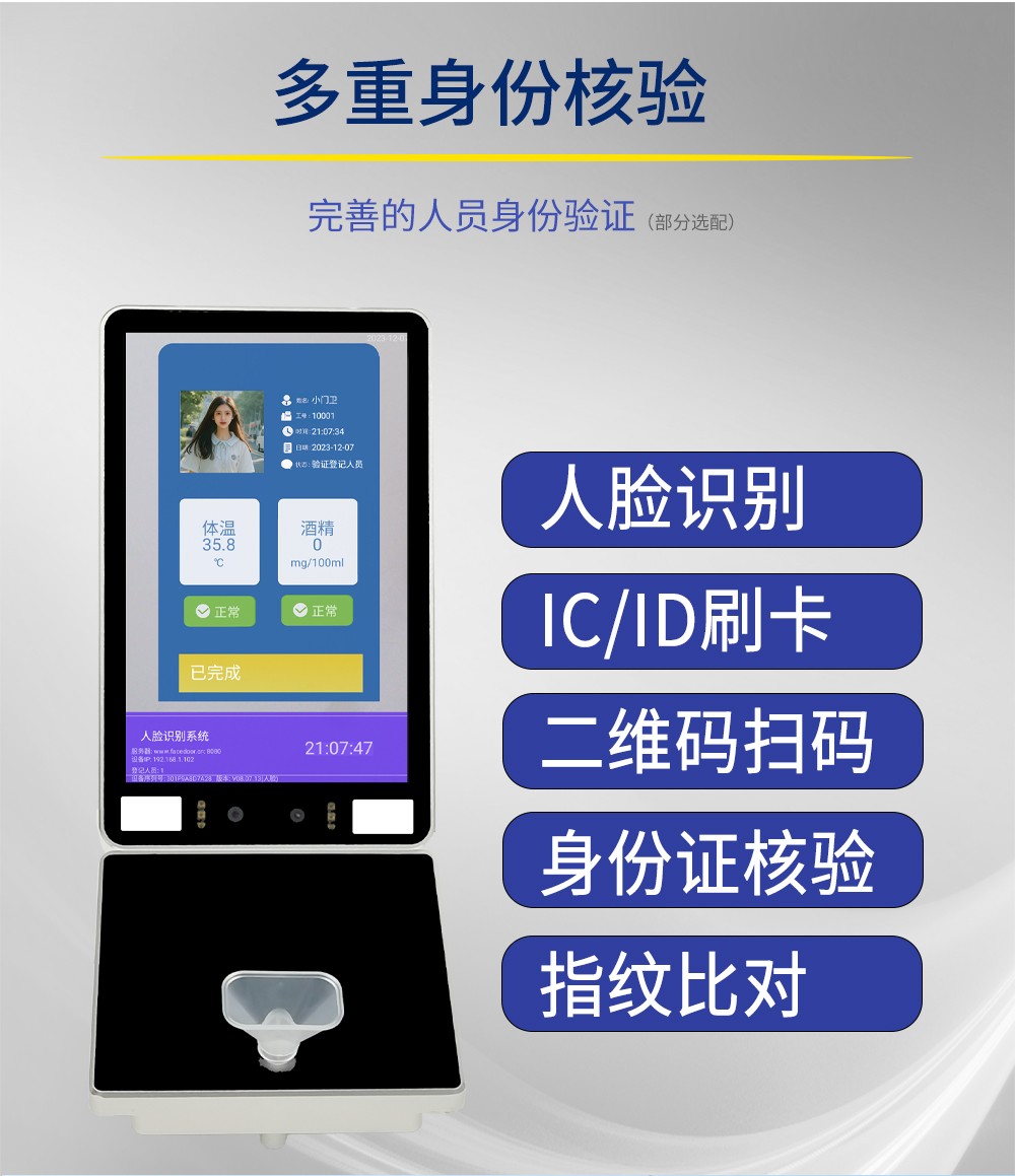 小门卫岗前酒精检测打卡测温一体机防代吹,是专为企业岗前安全管理设计的一体化智能设备,能同时完成酒精检测、考小门卫岗前酒精检测打卡测温一体机,是专为企业岗前安全管理设计的一体化智能设备,能同时完成酒精检测、考勤打卡核心功能,大幅提升岗前筛查效率。采用高精度传感器,快速检测呼气酒精浓度,结果即时显示,超标自动预警,杜绝酒后上岗风险,支持人脸识别、刷卡等多种打卡方式,打卡与安全检测数据联动,确保考勤记录