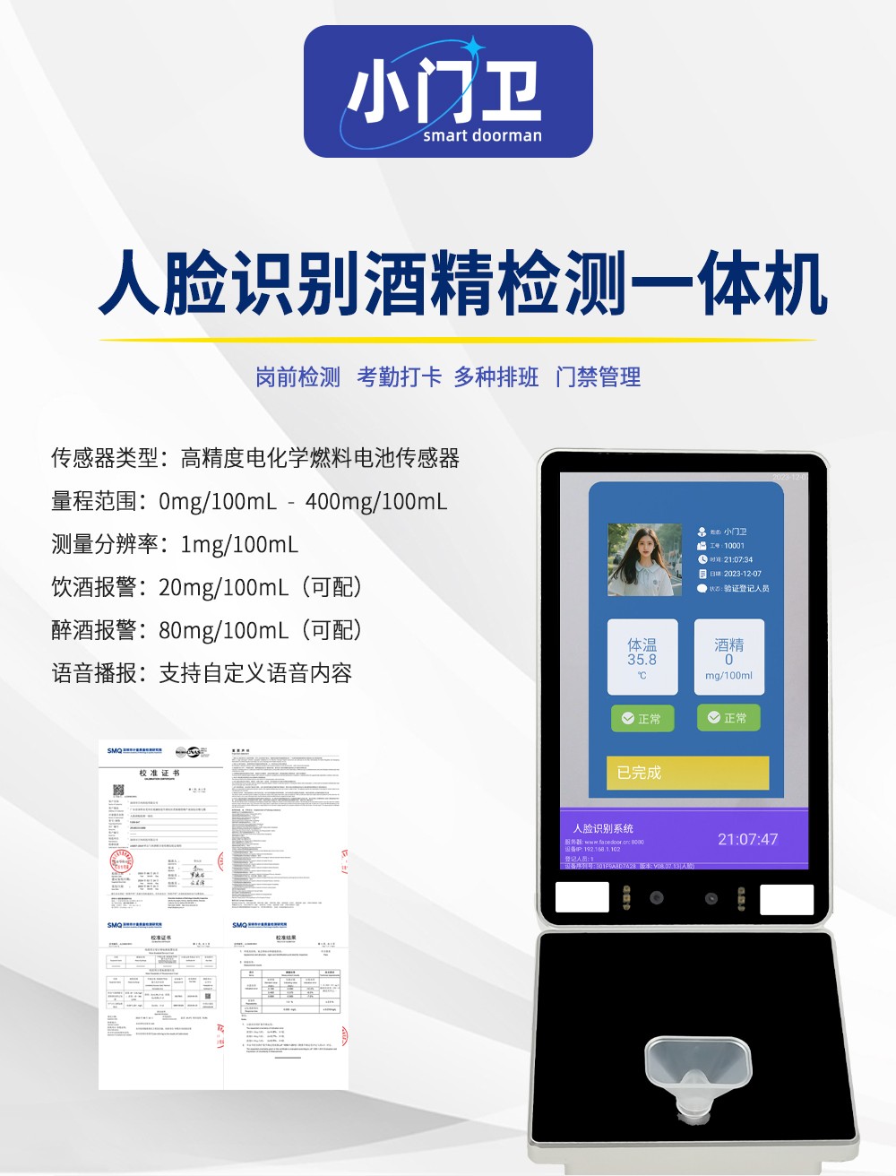 岗前门禁考勤机血压酒精检