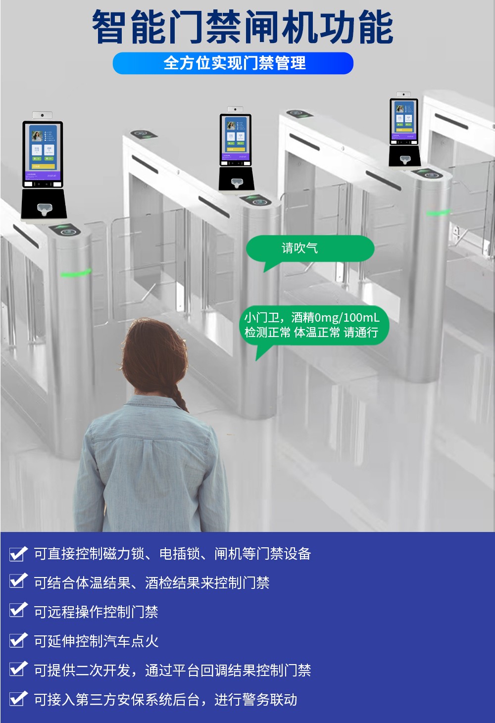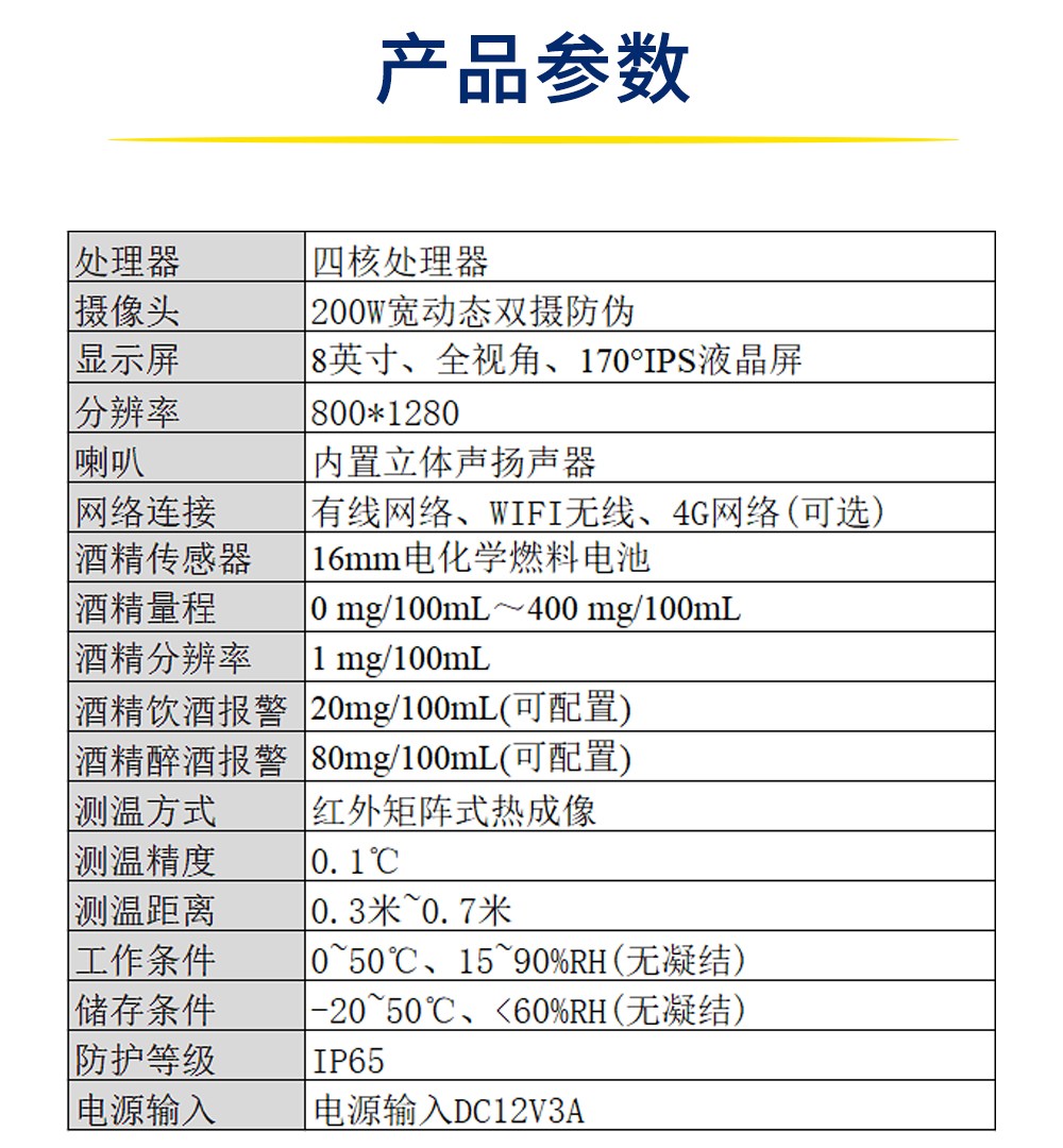 小门卫中标酒精检测防代吹测血压测温速通门支持人脸识别、IC/ID 刷卡、二维码扫码、证件核验、指纹比对等多种方式,确保人员身份准确无误,其中人脸识别采用 200W 宽动态双摄防伪,可有效杜绝照片及视频代打卡。酒精检测防代吹:采用 16mm 电化学燃料电池传感器,酒精量程为 0mg/100mL-400mg/100mL,分辨率为 1mg/100mL,饮酒报警值为 20mg/100mL(可配置)