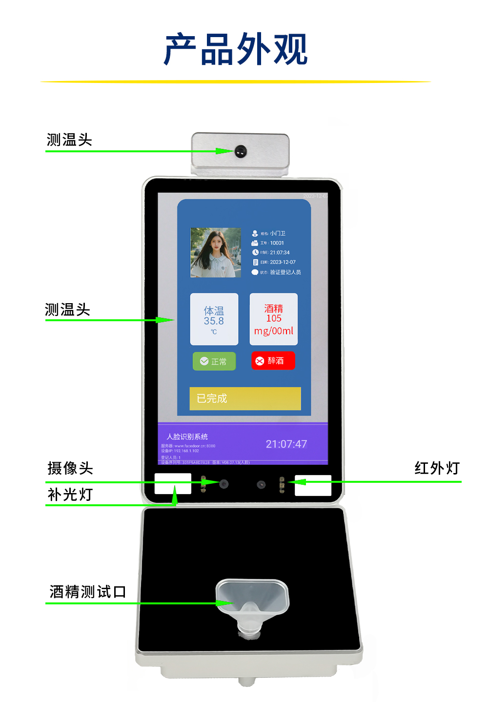 壁挂式人脸识别酒清检测考