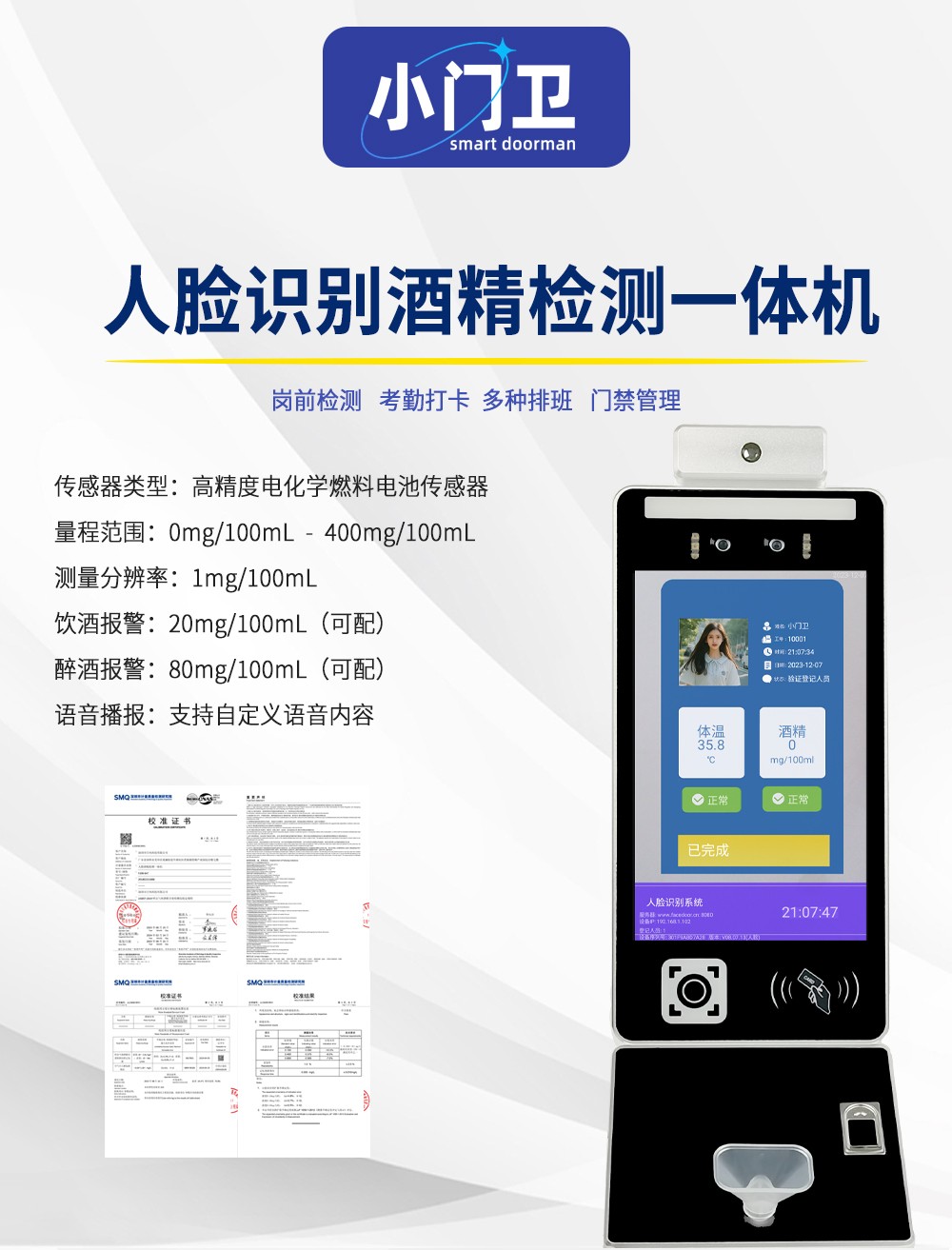 岗前门禁考勤机血压酒精检