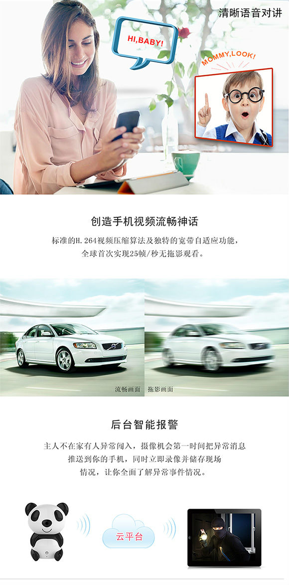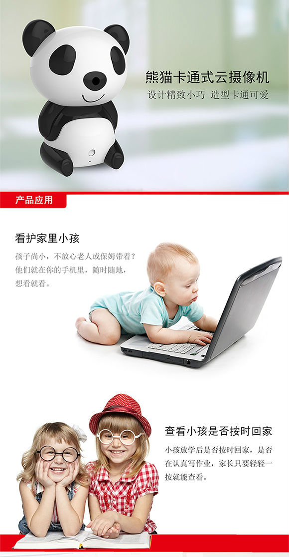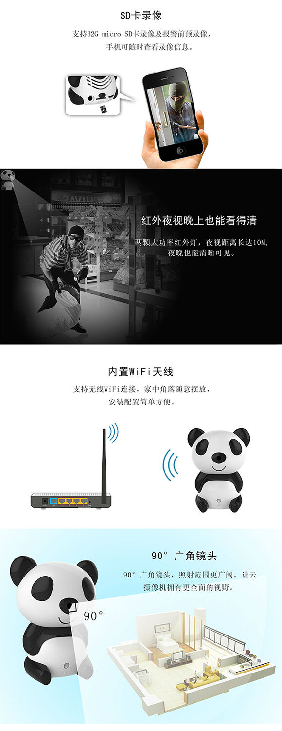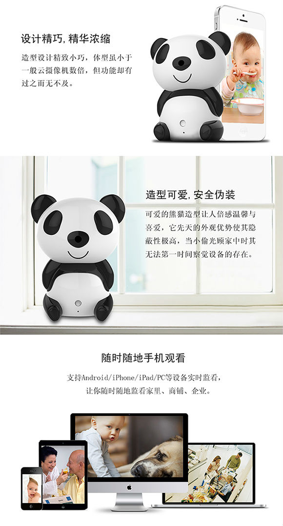 可爱的熊猫卡通式外观完全颠覆了传统摄像机严肃冰冷的形象,黑白搭配的外壳更是高贵大气,和您的室内装修设计精妙融合。